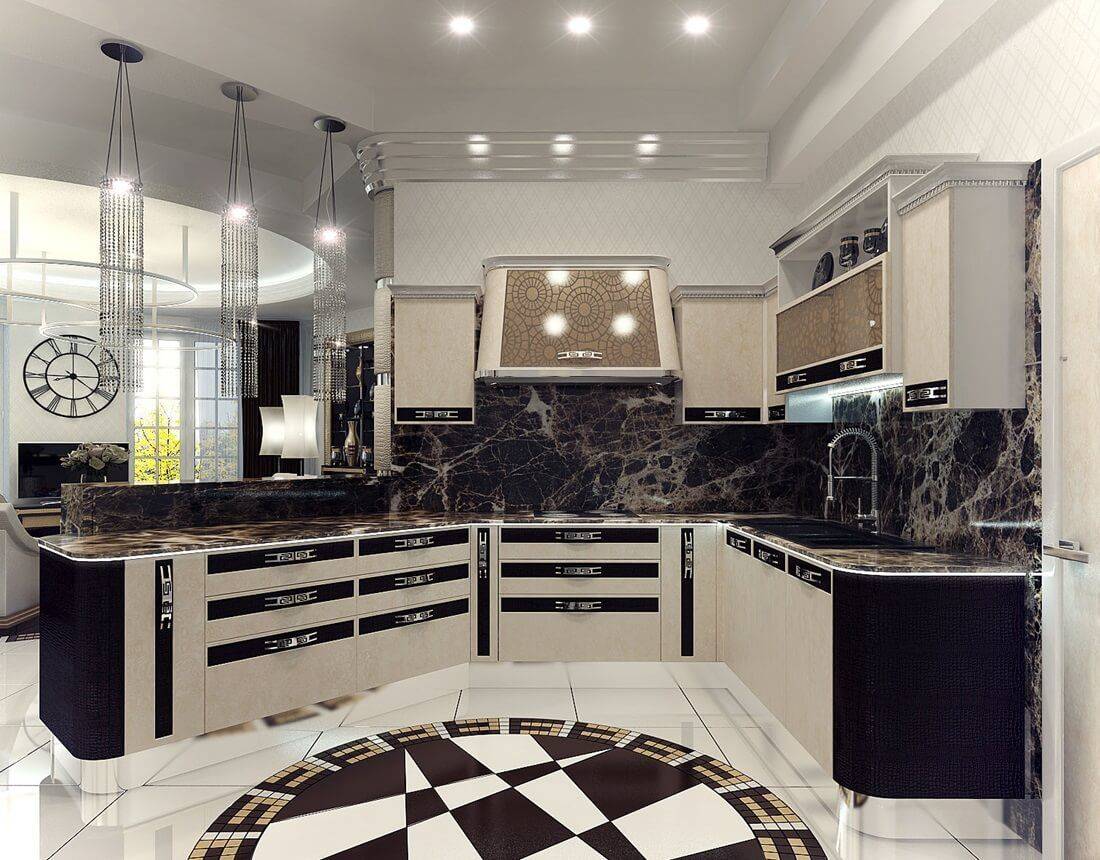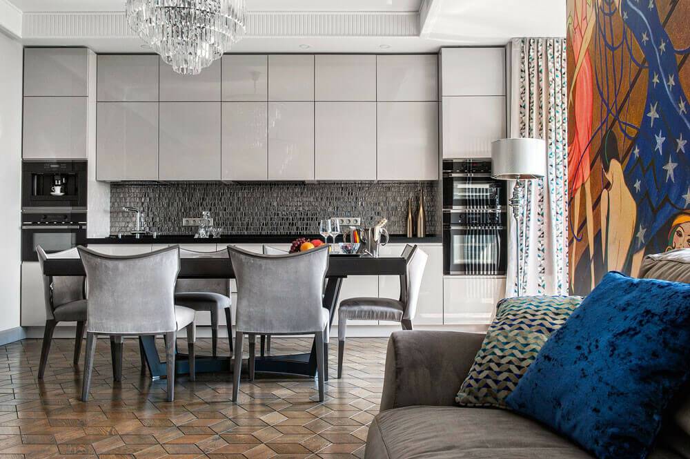 В кухне-гостиной часто можно наблюдать геометрические фигуры, столь характерные для арт-деко, которым был придан современный характер. Модульные шкафы в форме кубов расположены интересным образом друг к другу, создавая геометрические тела. Узоры на полу чрезвычайно интересны.