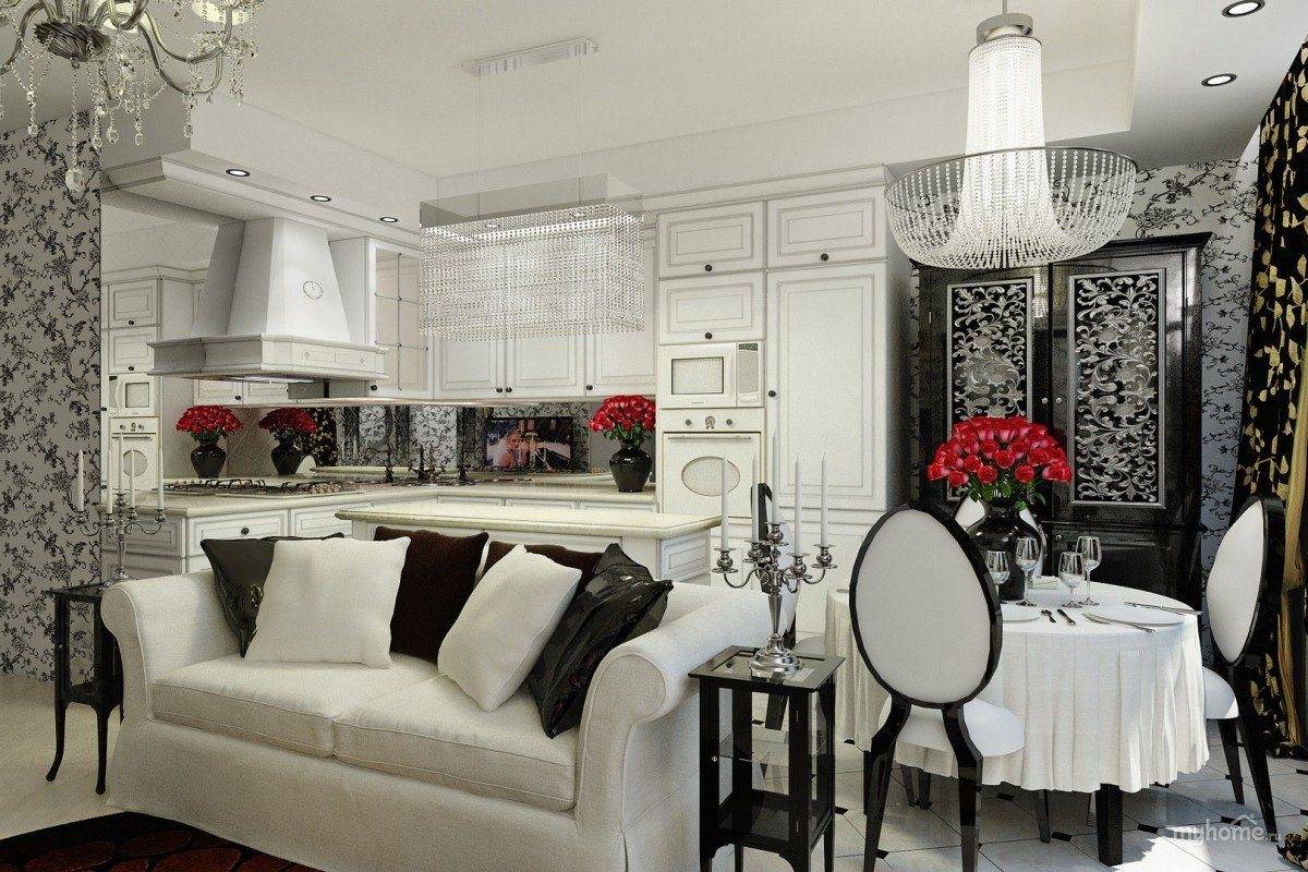 Стиль арт-деко гармоничен, но, как ни парадоксально, в нем много контрастов. Он любит черно-белое сочетание, ценит благородно отделанную мебель с прямыми линиями. Умно сочетает функциональность с утонченной элегантностью. Поэтому кухня-гостиная в стиле арт-деко — прекрасное оформление. Одной из особенностей является привязанность к геометрии, особенно овальной, полукруглой формы. Кухня-гостиная идеально вписывается в эту эстетику, используя округление, чтобы придать интерьеру уникальный визуальный характер. Особенно кухонный остров бросается в глаза, радуя своей необычной формой. Не только округлые формы, но и орнаментация фасадов шкафов, а также элегантные классические цвета относятся к непосредственности арт-деко.