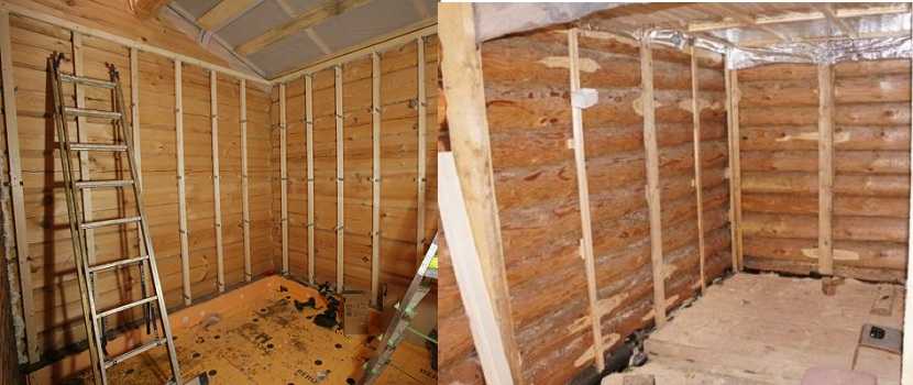 Обрешетка в доме из бруса или бревна делается одинаково:нужно помнить, что она должна «плавать» чтобы отделка не отлетела