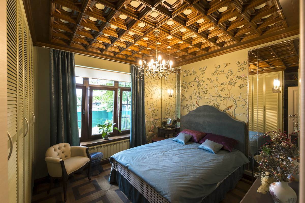 В отличии от гостиной, спальня может быть меньше по площади и иметь уникальный стиль интерьера. Особенно колоритно в деревянном доме смотрится интерьер спальни в стиле кантри. Классический, деревенский, русский и подобные стили тоже будут как нельзя кстати.