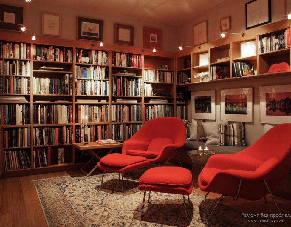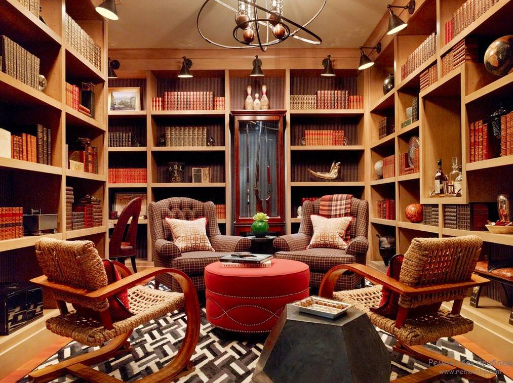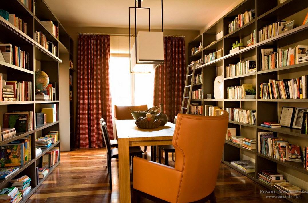 Переплет книги, плотная текстура бумаги, вдумчивое настроение предполагают сделать соответствующий интерьер библиотеки. А если таковой дома нет, то создать самому.