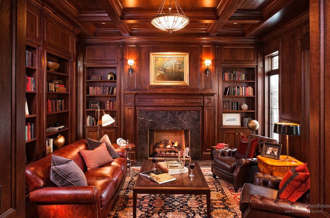 Книжные полки могут украшаться личными вещами или различными сувенирами и декоративными тарелками. Кстати, имеет смысл ими разбавить ряды с книгами. В таком случае, если будет необходимо расширение книжной коллекции, место для новых экземпляров у вас уже будет уготовано. Относительно стола – для гостиной чудесно подойдет журнальный столик вместо письменного, который уместен в кабинете. Также помимо этого, можно разместить плазменный телевизор, диван с пуфиком – все на ваше рассмотрение. В качестве аксессуаров прекрасно подойдут картины или декоративные вазоны с красивыми цветами. Всегда уместен будет и уютный камин в гостиной. Очень хорошо смягчить пространство при помощи удобных сидячих мест, а также, ковров.
