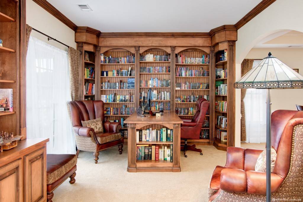 Для оформления библиотеки лучшим вариантом являются библиотечные шкафы. Чаще всего отдельное помещение для библиотеки оборудуют в частных апартаментах, совмещая ее с кабинетом.