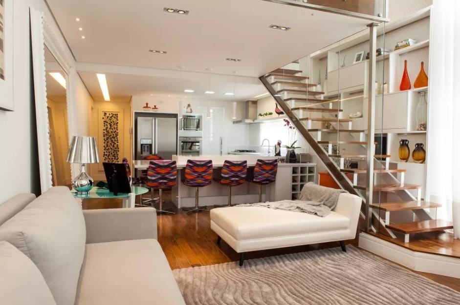 Кухня-гостиная с лестницей имеет следующие преимущества: