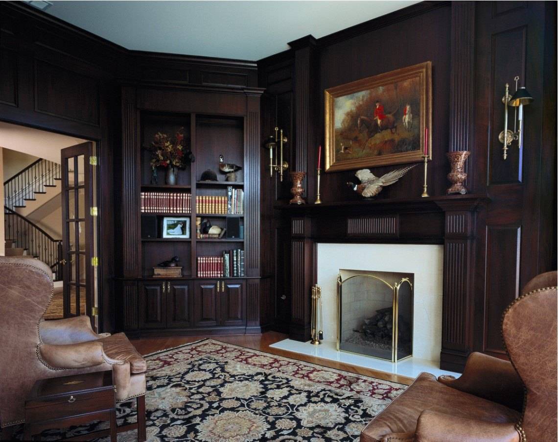 Темный интерьер прекрасно справляется ещё с одной задачей и идеально подходит для оформления гостиной-библиотеки. Мягкая атмосфера и приглушенный свет, тишина и покой очень важны для книг. Данная обстановка позволит целиком погрузиться в чтение и ничто не сможет отвлечь от захватывающего и интересного сюжета любимого литературного произведения. Помимо безмятежности и спокойствия темные цвета способствуют отличной работе мысли.