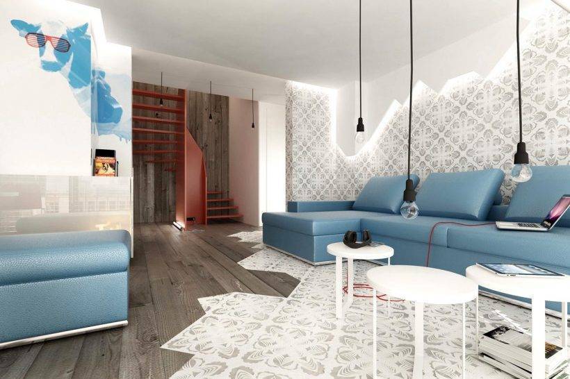 Пол покрывают ламинатом, светлыми досками, линолеумом, в том числе бледно-синим, окрашивают краской. Напольная керамическая плитка с узорами применяется редко – она слишком холодная, даже при наличии ковра. Если для зонирования пространства решено сделать подиум, его цвет делается контрастным с основным напольным покрытием.