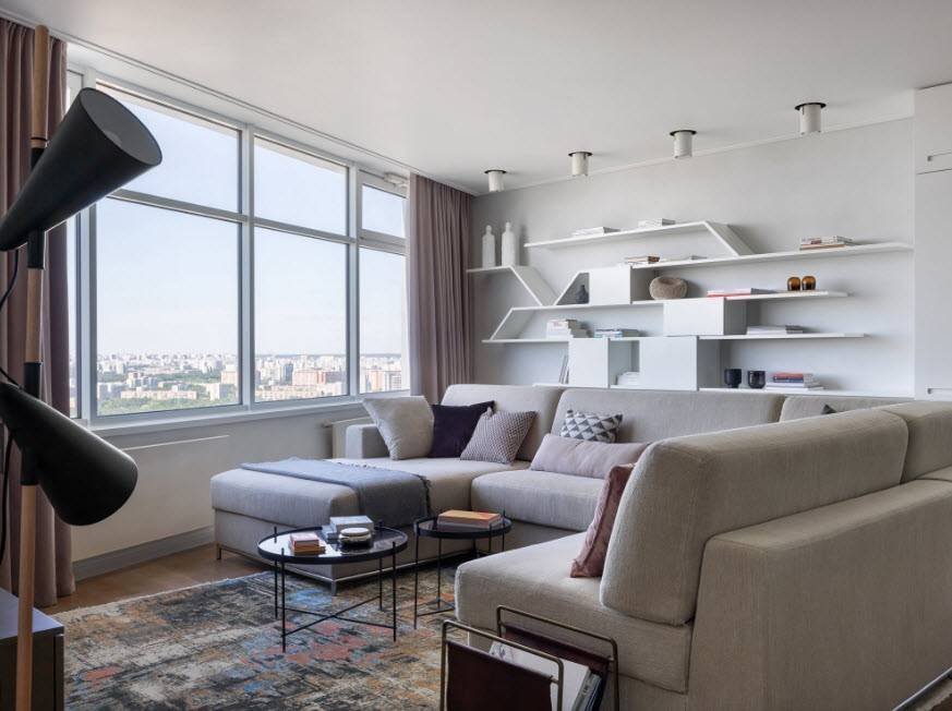 Нейтральная палитра – идеальное решение как для просторного помещения, объединенного с кухней, столовой, кабинетом или даже спальней, так и для малогабаритного жилья. Даже в большей степени светлые тона более применимы в квартире, где гостиная не радует обширной площадью.