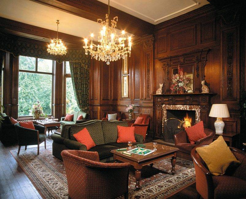 Акцент делается на деревянной мебели из дорогих пород, обязательным атрибутом этого стиля является наличие камина.