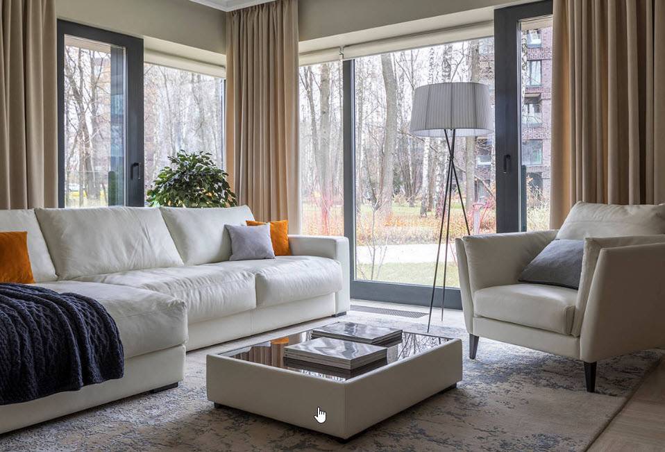 Чтобы в комнате было больше естественного света днём, не стоит использовать слишком плотные и тёмные ткани. Полупрозрачные или прозрачные лёгкие занавески легко пропускают свет. Более компактная альтернатива шторам — жалюзи, позволяющие регулировать количество света, поступающего в гостиную.