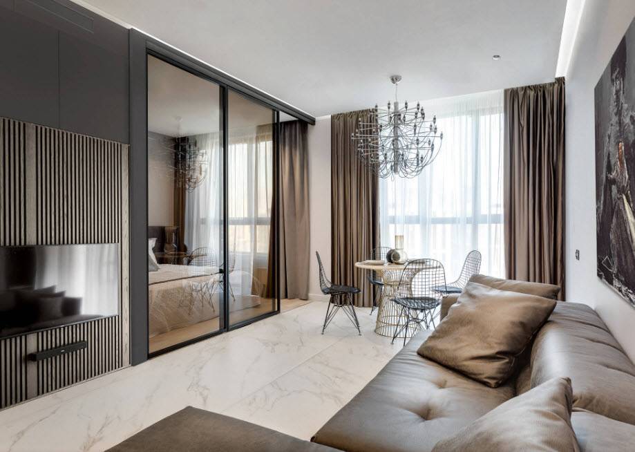 - Изолирование проходной гостиной от коридора с помощью раздвижных дверей-купе.