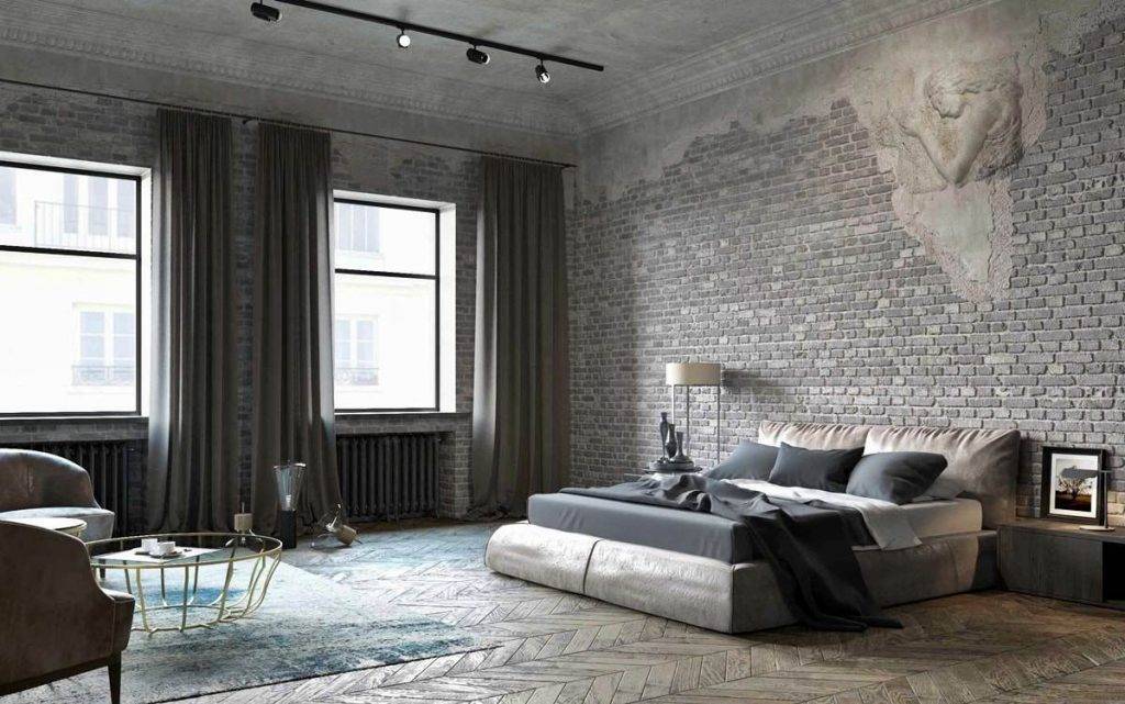 Акцент на спальном месте, наличие грубой штукатурки и деталей с кирпичной кладкой на стенах подчеркнет особенности направления и сделает интерьер уникальным.