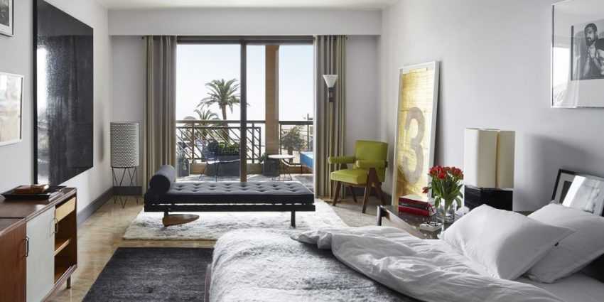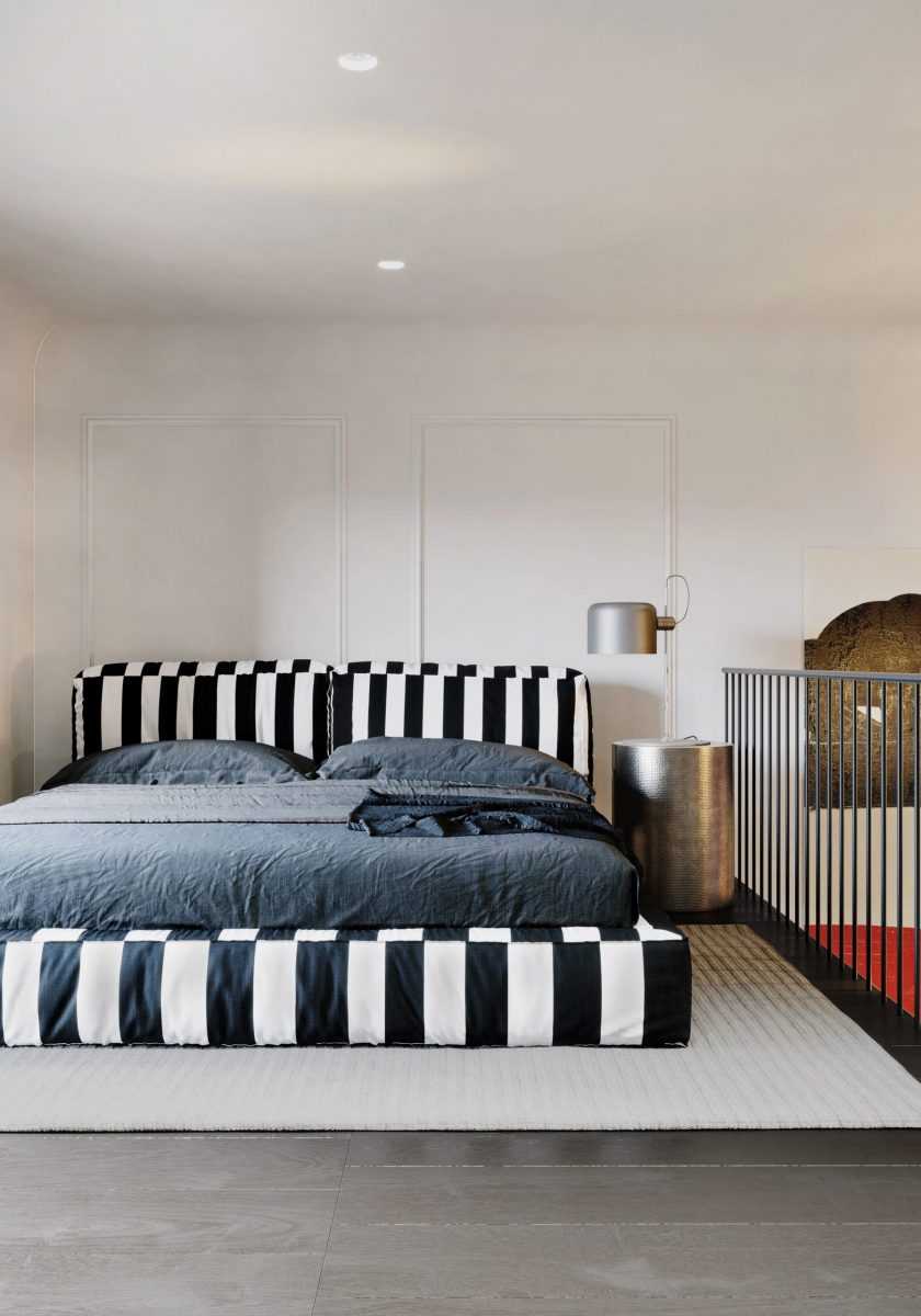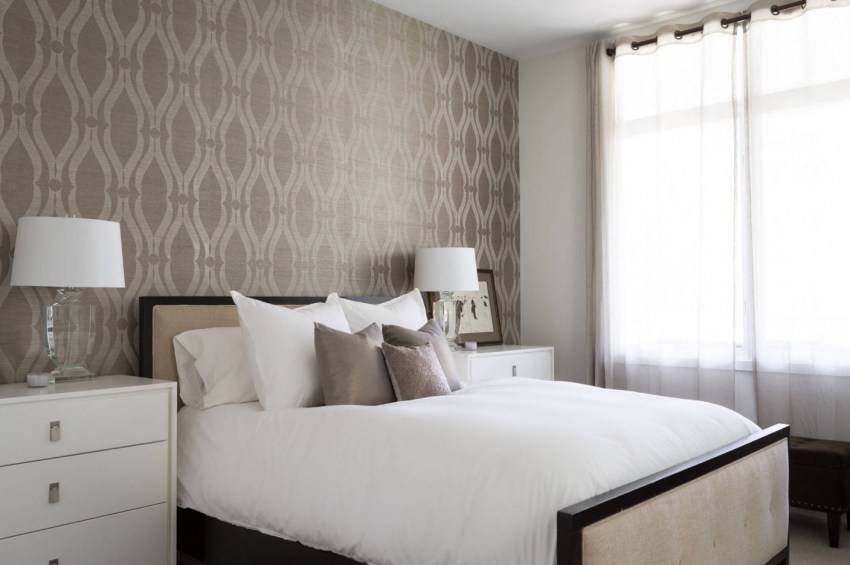 Стены в спальнях современного стиля однотонные или с графическим рисунком