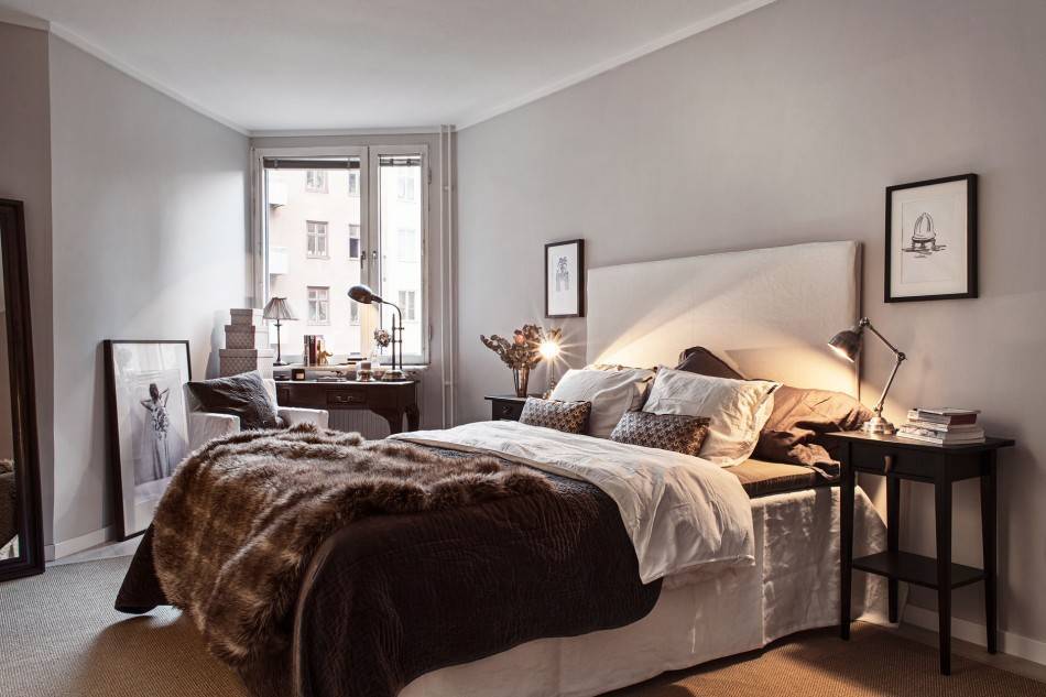 Светильники, бра и торшеры предназначены для освещения и наполнения комнаты светом, поэтому нередко в скандинавских спальнях встречаются обычные лампы накаливания.