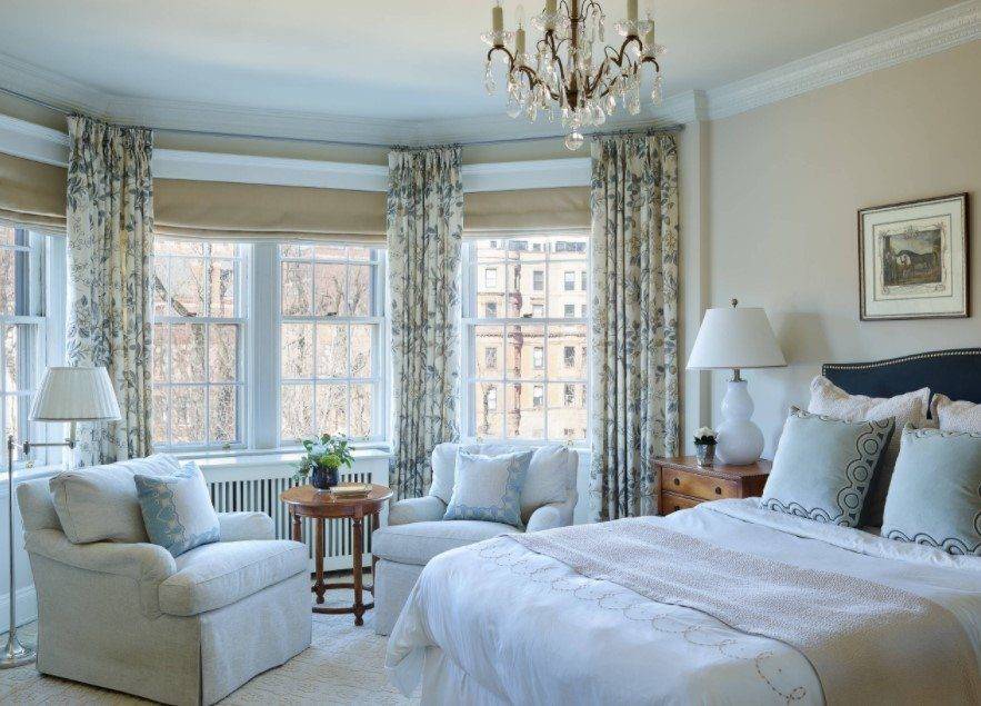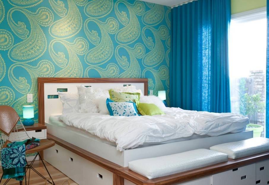 Зелёные шторы и покрывало, способствуют более быстрому обретению расслабленного и умиротворённого состояния. Синие оттенки настраивают на спокойный сон. Бежевые аксессуары наполнят комнату ощущением защищённости и безопасности. Что касается более ярких вариаций, то в этом случае всё зависит от вашего предпочтения и характера общего оформления. Шторы и покрывало для спальни могут быть выполнены в одном дизайне, а могут просто подбираться под весь стиль. В таком случае дизайнеры не советуют одновременно сочетать в спальне более трёх оттенков.