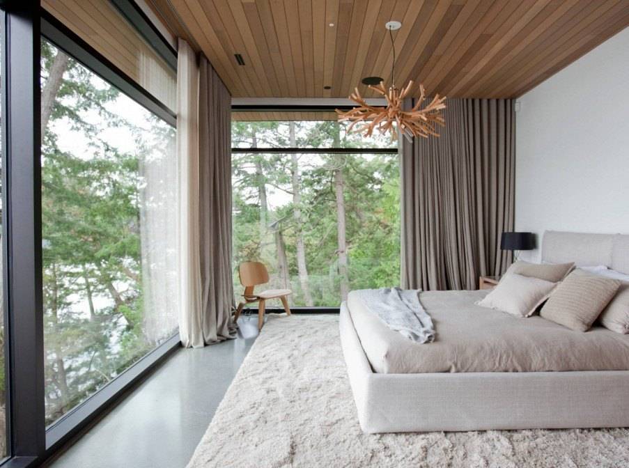 Верный друг всех современных интерьеров – натяжные потолки, которые идеально отражают концепцию самого стиля. Полотно может быть как глянцевым, так и матовым, а вот сатин, текстиль и фотопечать почти не используются. В просторных спальнях для зонирования и многоуровневого освещения хороши гипсокартонные коробы.