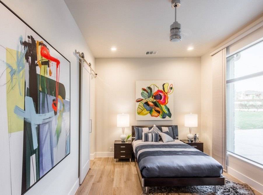 Пустующую стену за изголовьем можно украсить недорогой репродукцией, постером или яркими необычными плакатами. В детской на стену можно повесить меловую доску: так дизайн спальни можно будет менять хоть каждый день.