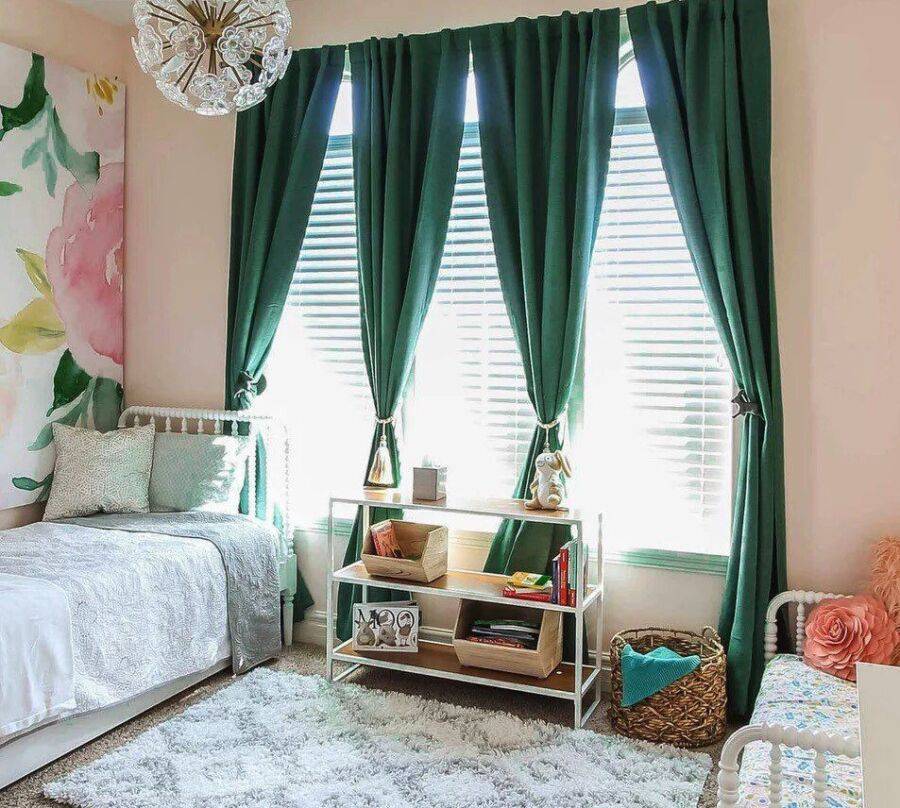 - Комната для сна. Можно использовать салатовые или фисташковые оттенки. Для интерьера подойдут темно-зеленые, изумрудные или малахитовые гардины.