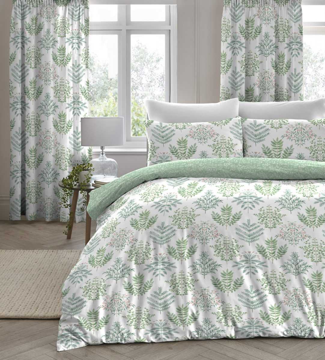 Для спальни, выполненной в светлых зеленых оттенках, нужно выбирать более темные шторы и наоборот. Сюда органично подойдут как однотонные портьеры, так и ткани с вышитым узором или рисунком.