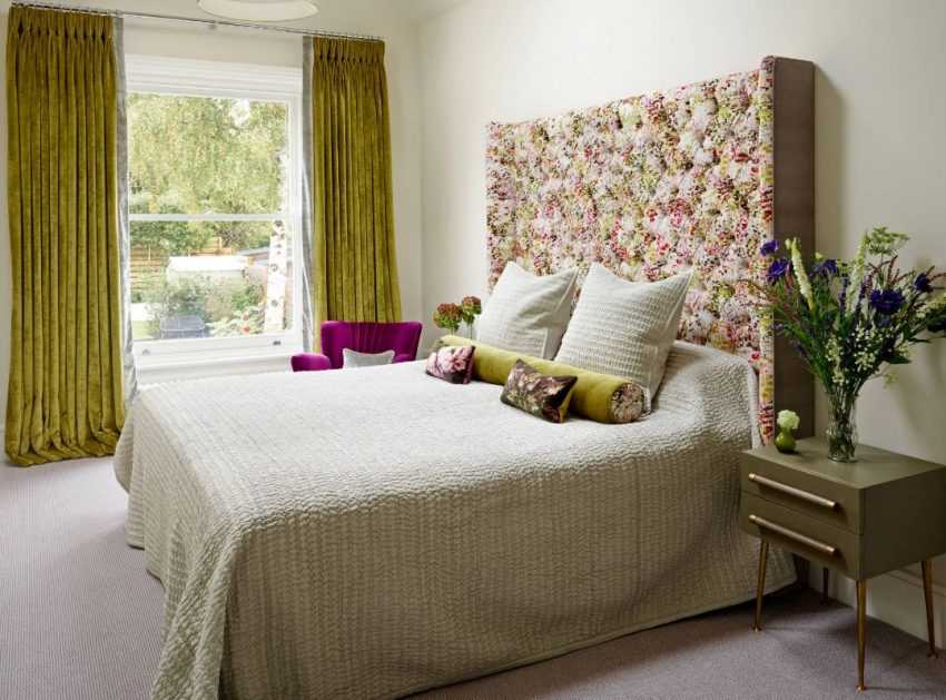 Текстиль также может использоваться для украшения изголовья кровати или балдахина. Особенно это характерно для романтического стиля. Яркие акценты в таких интерьерах создаются за счет занавесок, подушек, покрывал, картин, молдингов или декоративных ваз с букетами цветов.