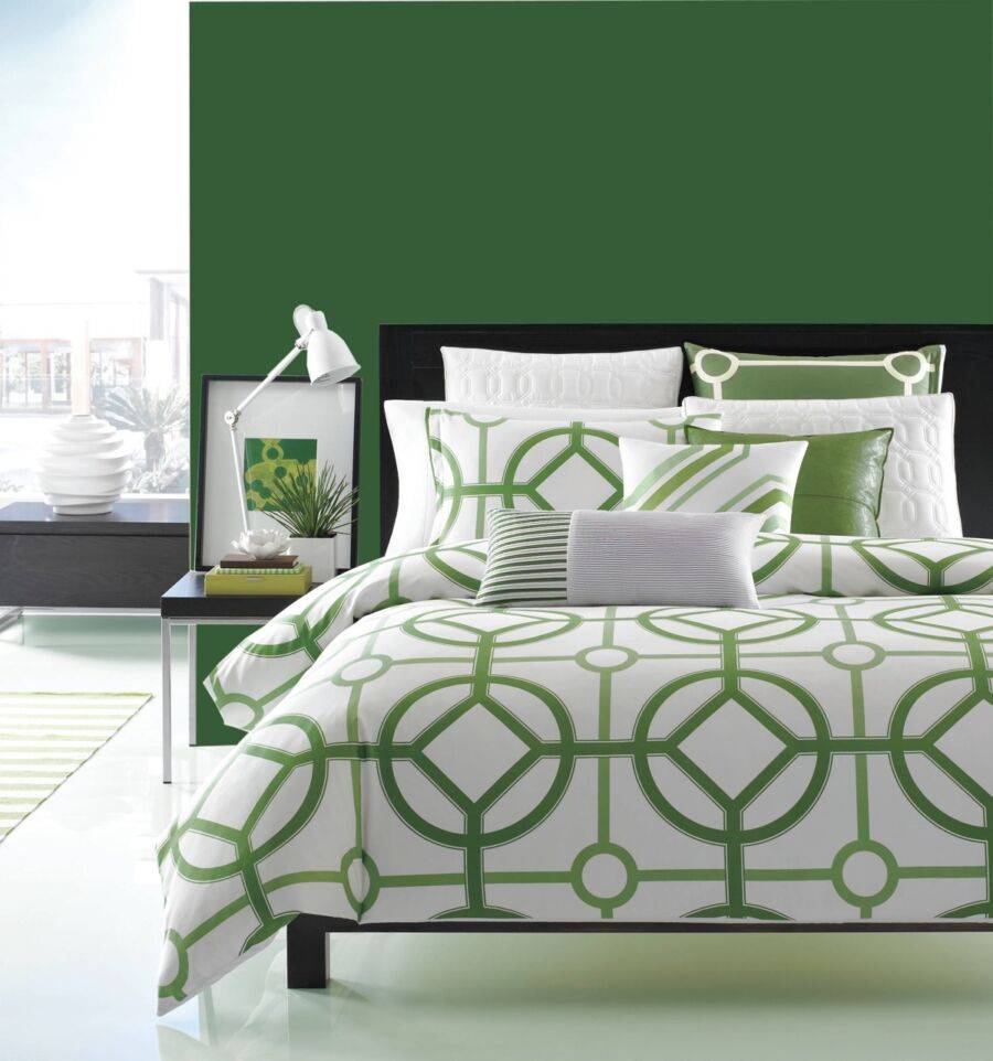 Если вам захочется оживить зеленую спальню в пастельных тонах, можно внести в нее сочные, насыщенные детали в той же гамме или противоположной. Хорошо подходят для этих целей: