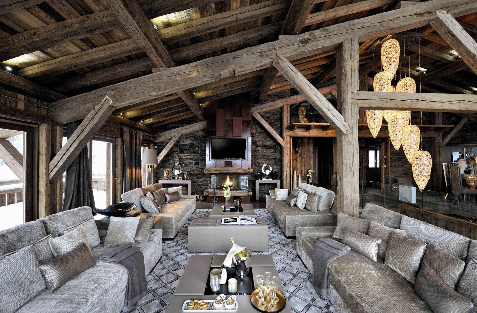 Потолок в гостиной шале является одной из самых ярких деталей. Его узнаваемая черта — перекрытия, массивные деревянные балки, которые изначально служили несущими конструкциями, а сегодня играют декоративную роль. Чтобы балки выглядели максимально аутентично, их не красят и не лакируют; дерево должно иметь состаренный вид.