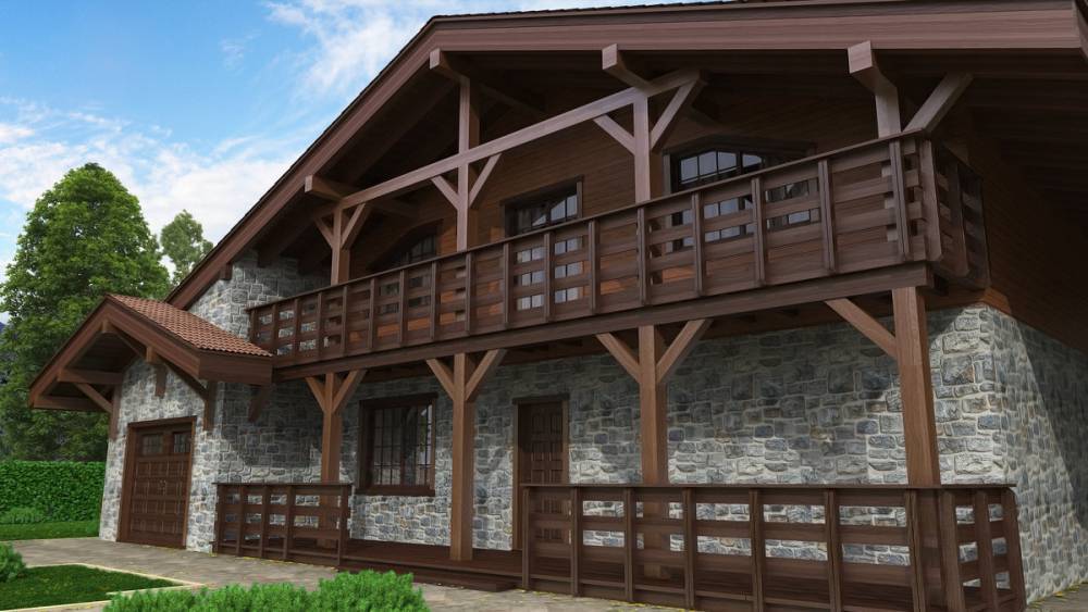 При строительстве использовали натуральную древесину и камень. Дерево применяли при строительстве основного этажа и дополнительной мансарды. А цокольный этаж и прочный фундамент уже делали из камня. Шале в альпийском стиле выглядели так, будто врастали в каменную основу.