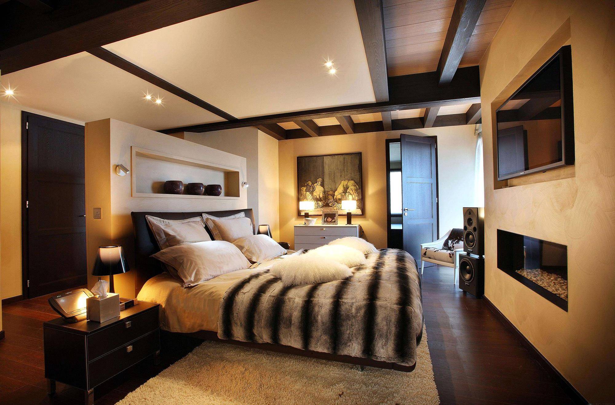 Камин — визитная карточка стиля, место фокусировки интерьера. Он устанавливается в гостиной, а то и в спальне, облицовывается камнем. Встречаются электрические камины, над которыми вполне естественно выглядят плазменные телевизоры.