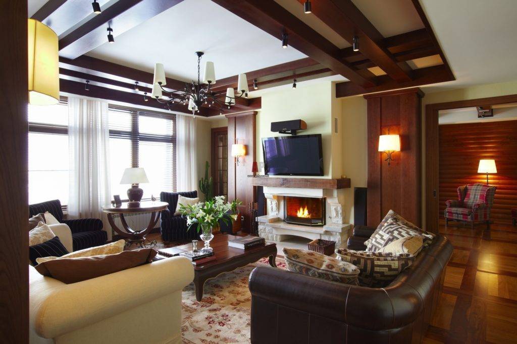 Имитация потолочных балок и искусственный камин подойдут для интерьера шале