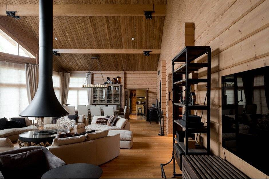 Применение грубых балок и других неотёсанных элементов не подойдёт для малогабаритных гостиных, поэтому в таких интерьерах применяют лишь отшлифованные и гладкие материалы.