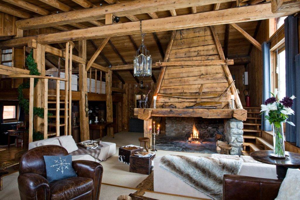 Массивная мягкая мебель и камин — важные элементы гостиной в стиле шале