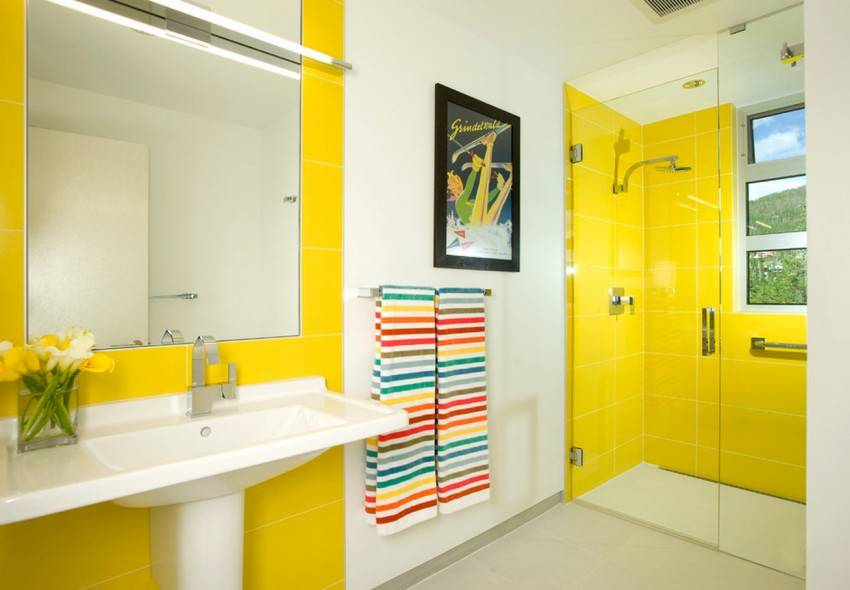 Чтобы ванная при этом не выглядела слишком уж стерильной, светлый цвет разбавляют яркими элементами. Вариантов несколько — бордюр из более темной плитки, темная нижняя часть стены (примерно — нижняя треть). Если нижняя част стены темная, пол делают того же цвета или очень близкого, если не удается найти плитку того же тона.