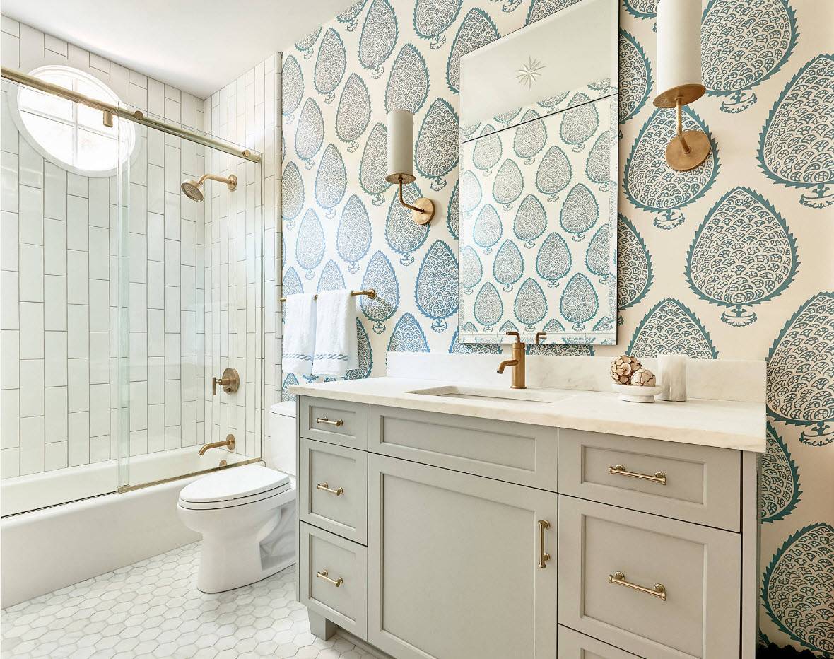 - Фрагмент стены, оклеенный виниловыми обоями с неярким вертикальным узором, гармонирует с выложенными однотонной плиткой поверхностями.