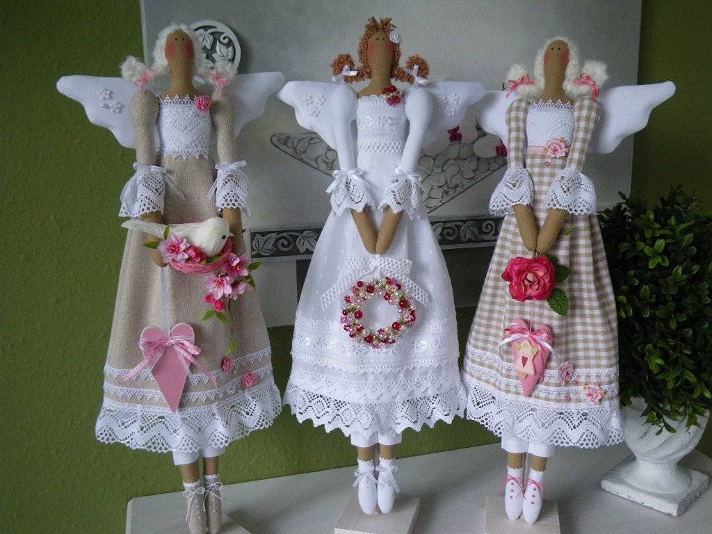 Популярностью у мастериц пользуются куклы в виде рождественского ангела. Такая поделка станет отличным украшением комнаты на новогодние праздники и создаст волшебную атмосферу. Также на Новый год часто шьются поделки из ткани в виде китайского символа года (например, желтой собаки). Эту игрушку можно использовать для украшения своего дома или подарить на праздник родственнице либо подруге.