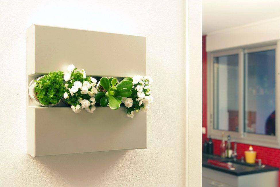 На фото искусственные цветы в виде фитостены