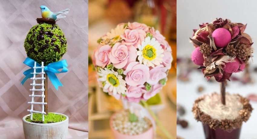 Топиарии. Так называются букеты, имеющие круглую форму и располагающиеся на длинном стволе-ножке. Для декора используют банты, атласную ленту, шарики, бусины.