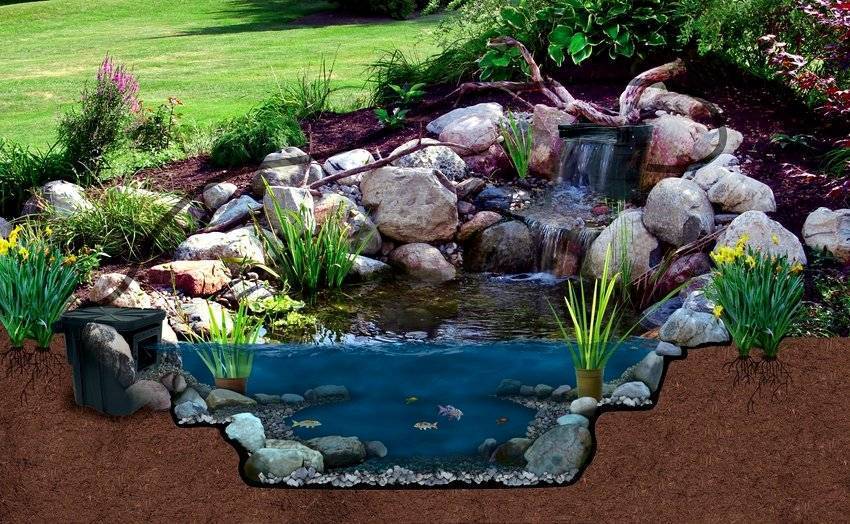 Для предотвращения застаивания воды нередко создают искусственный ручей, даже с небольшими водопадами. Вода в его исток подается погружным насосом через фильтр непосредственно из пруда.