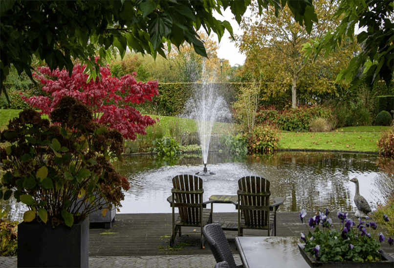 Осенью прудик требует наибольшего ухода, так как важно вовремя убирать листву. Также замечено, что вода практически не цветет при условии посадки нимфей