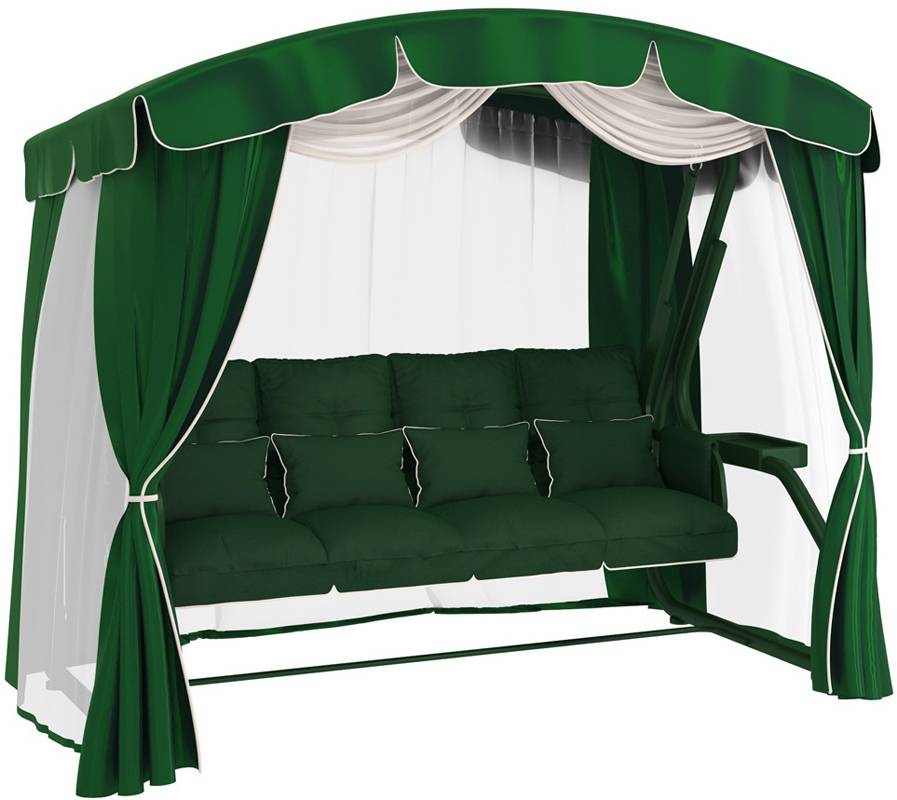 семейные – изделия с массивной и увесистой конструкцией. По своему устройству они напоминают скамейки без ножек с большой и высокой спинкой. За счет больших габаритов на сиденье может уместиться вся семья. Чтобы эксплуатация подобных качелей была безопасной, их надежно закрепляют на раме П-образной формы. В качестве фиксаторов используются прочные тросы или толстые цепи. Если организовать над качелями крышу или тентовый навес, ими можно пользоваться даже под дождем;