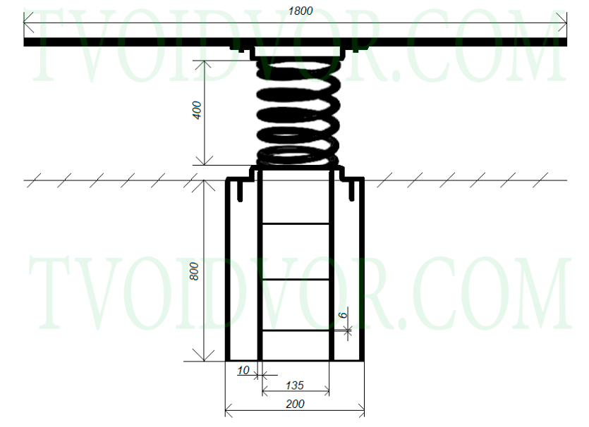 - Крепим пружину высотой 400 мм к закладной с помощью сварочного аппарата. Для достижения большей прочности вы можете внутрь пружины поместить еще одну, чтобы качеля сильно не раскачивалась, но это не обязательное условие. Также можно дополнительно закрепить пружину как это показано на фото ниже.