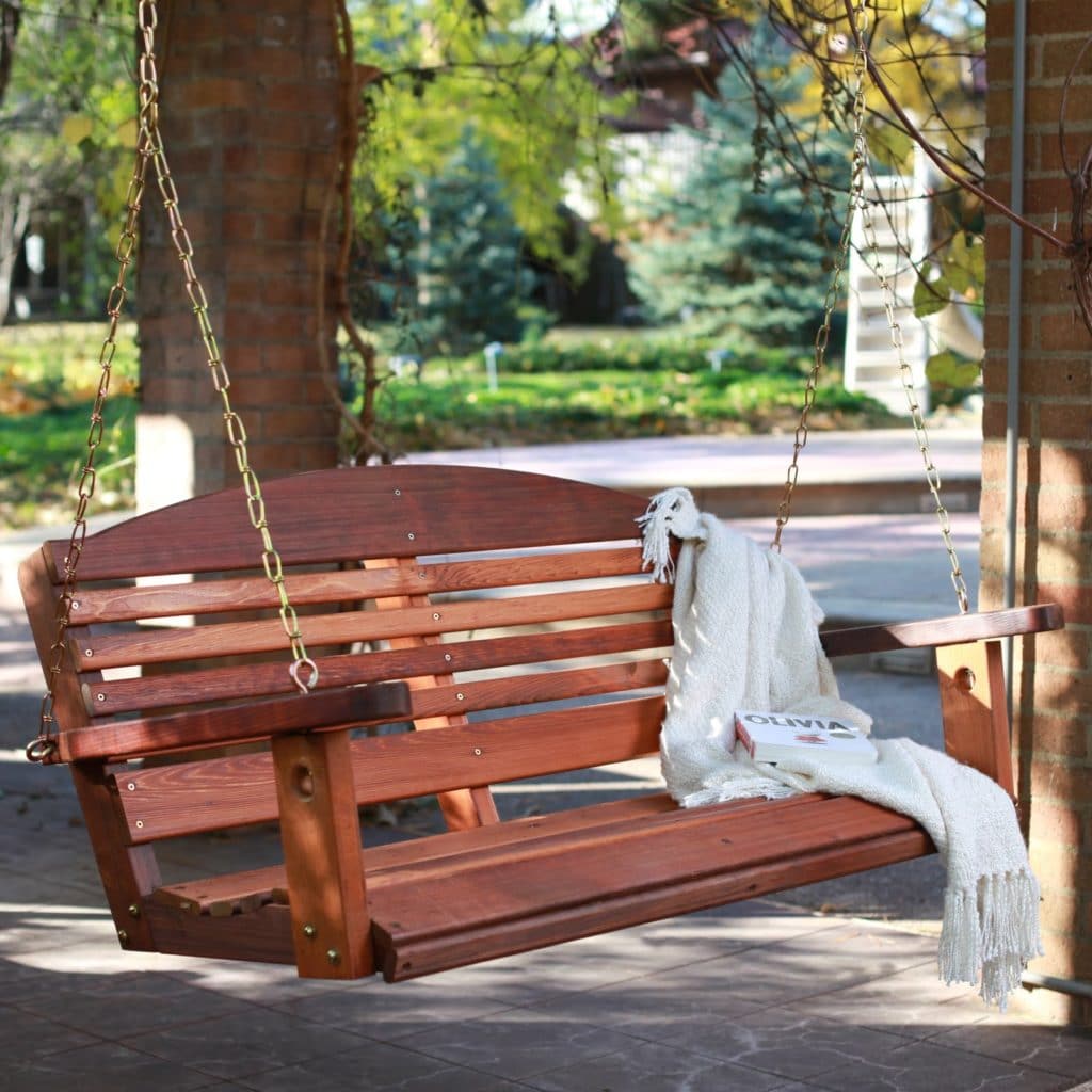 Тебе понадобится: Около 0,2 кубометров древесины для каркаса и скамейки, крюки, кронштейны, рейки, болты с гайками, цепь.Как сделать: Сначала подбери подходящий чертеж – они довольно однотипные, так что выбирай по размерам. Все доски нужно нарезать, почистить и обработать специальной грунтовкой. Тебе понадобятся брусья разной толщины – подробнее проще рассмотреть на видео.