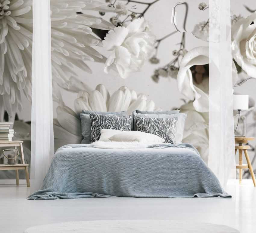 Женская спальня должна выглядеть более нежной и светлой. Наклейте в такой комнате обои с флористическими композициями или любым другим принтом небольшого размера.