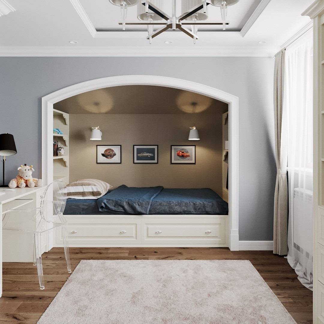- Монтаж ниши. Если планировка комнаты предусматривает нишу (или вы возвели её самостоятельно), то это будет просто отличным вариантом для тех, кто совмещает, например, спальню и гостиную в одной комнате. Укромный уголок позволит не только индивидуализировать пространство для отдыха, но ещё и визуально сделает комнату более правильной формы. Однако есть у этого варианта и минус – кровать будет окружена стенами с трёх сторон, а значит, проход к ней остаётся только один.