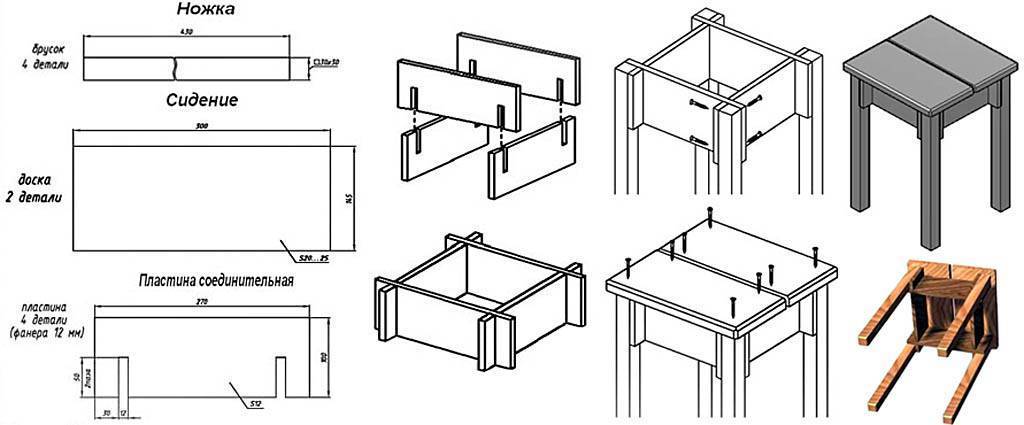 Табурет имеет простейшую конструкцию. Для его создания подойдут даже древесные отходы, бруски, фанера и пр. Стандартная и простейшая модель состоит из нескольких деталей, качественно подогнанных и надёжно соединенных.