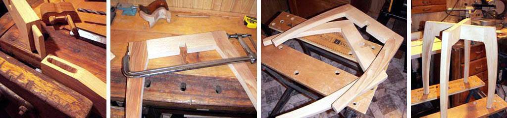 Для получения одинаковых углов на ножках пользуются стуслом. Царги размещают в сделанные в ножках выемки. Помимо соединения царгами примерно в средней части ножек, сверху непосредственно под сиденьем они также скрепляются поперечками.