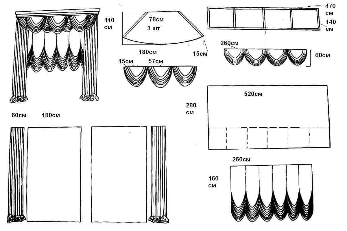 Если предстоит пошив комбинированных штор своими руками, где есть ламбрекен, подхваты или декоративные детали, используйте лекала, чтобы прочертить криволинейные детали на эскизе, потом это переносится на ткань в масштабе.