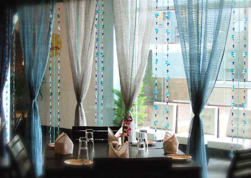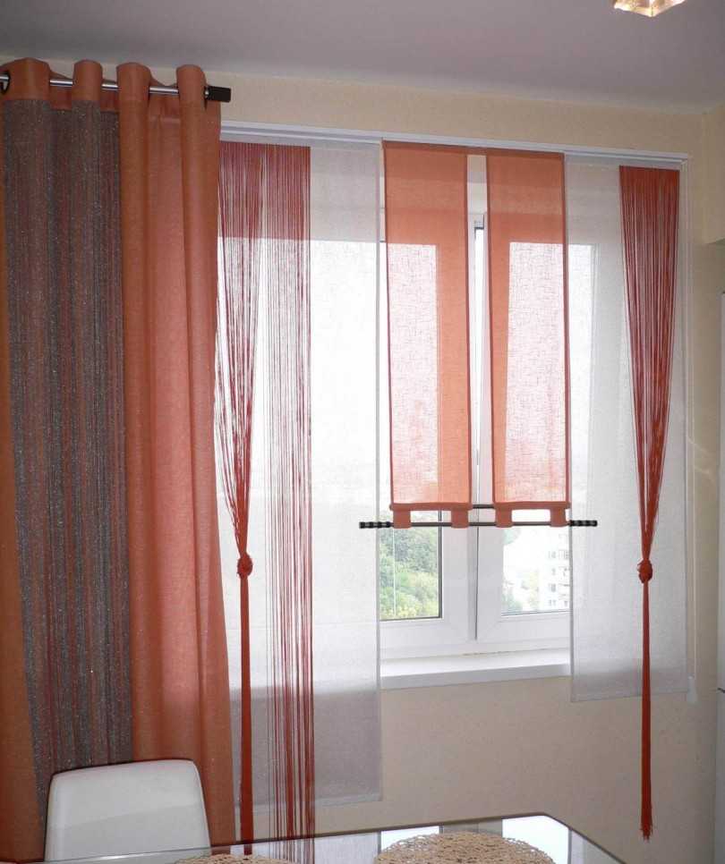 Нити используются как дополнение к основным шторкам – сами по себе совсем не защищают от солнца. Хорошо выглядят нити их двух тонов. Нитями украшают не только окна, но и дверные проемы, арки.