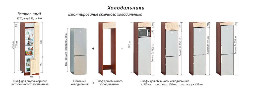 Чтобы встроить обычный холодильник, нужно изготовить короб, в который потом встраивается холодильник. Можно воспользоваться услугами профессионалов или смастерить шкаф своими руками, ведь так вы сможете значительно сэкономить.