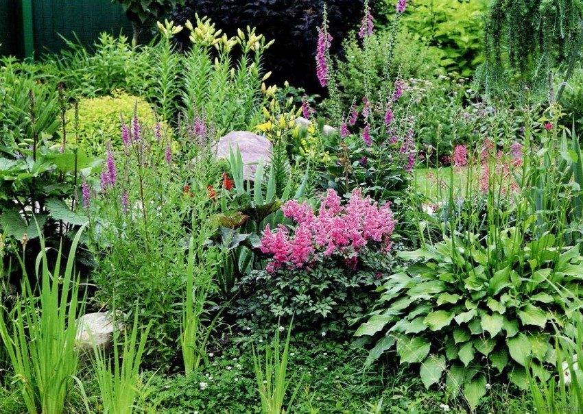 Еще одним вариантом может быть миксбордер только из высокорастущих растений. Как фон высаживается сочный зеленый папоротник, а перед ним – любой вид высоких цветов с ярким окрасом, например, астильбы.