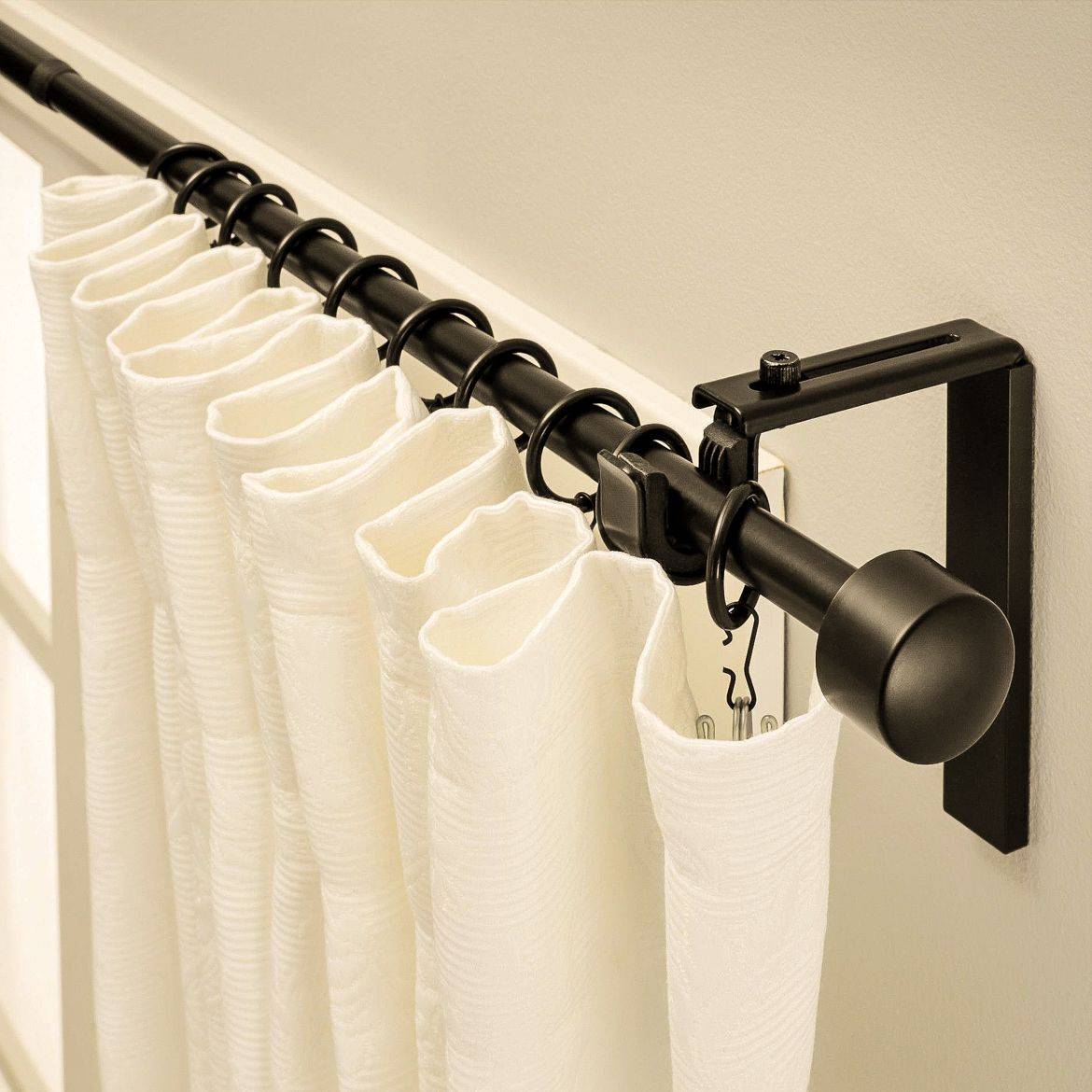 Есть еще такая экзотическая разновидность, как распорный карниз. Он представляет собой круглую штангу и устанавливается между стен. Держится он за счет установленных внутри пружин, которые “выталкивают” концы наружу. На такое крепление нельзя вешать тяжелый текстиль. К тому же перекладина оказывает постоянное давление на стену и способна повредить ее покрытие.