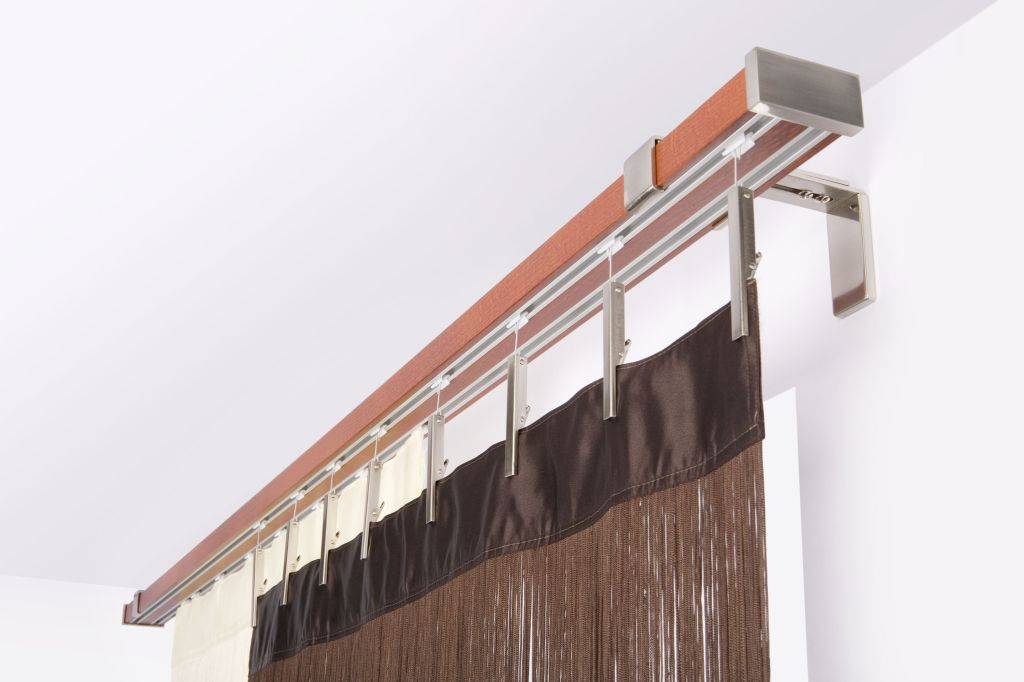 Профильные или рельсовые конструкции – это профиль с несколькими канавками. Внутрь дорожек вставляют крючки-бегунки, которые свободно перемещаются по всей длине до фиксаторов и заглушек. Если нужно закрыть или открыть портьеры, необходимо просто потянуть за ткань.
